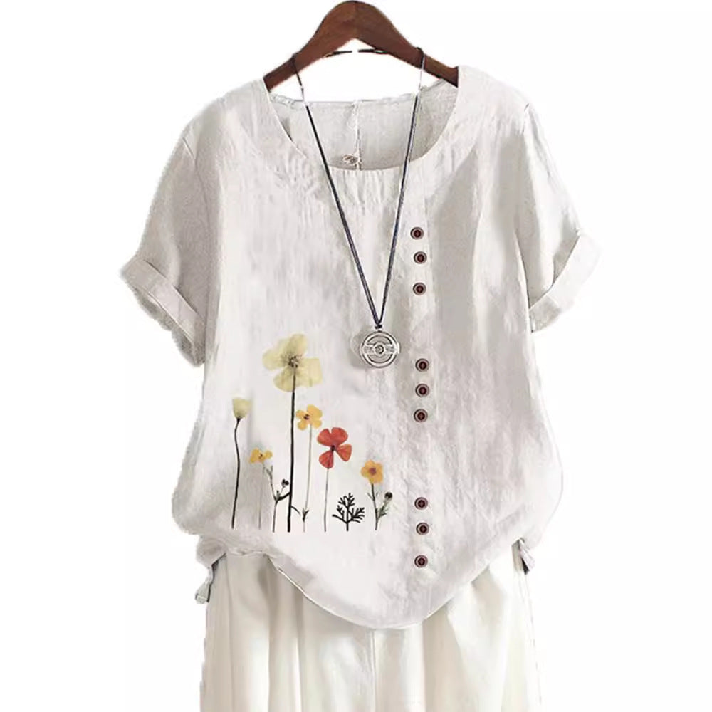 Cotton And Linen Printed Elegant Short Sleeve T-shirt Top Women