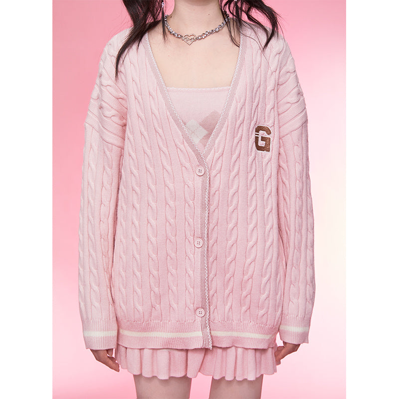 Color classification: pink twist knitted coat, pink rhombus vest, pink rhombus skirt