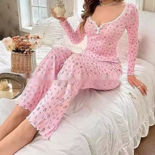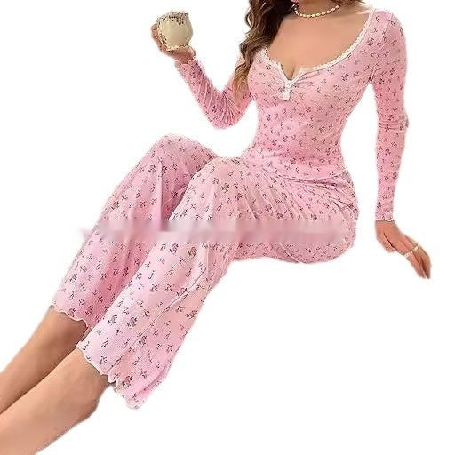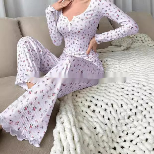 Small Floral Print Lettuce Edge Lace Collar Button Pajamas Suit