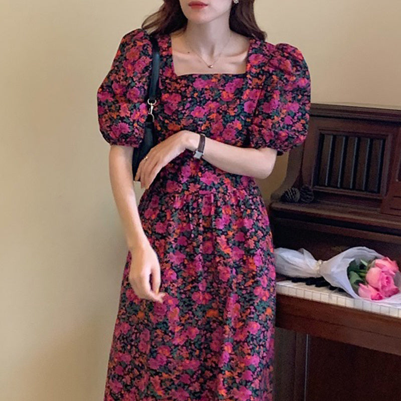 Square Collar Off-shoulder Lace-up Waist Puff Sleeve Floral Dress
