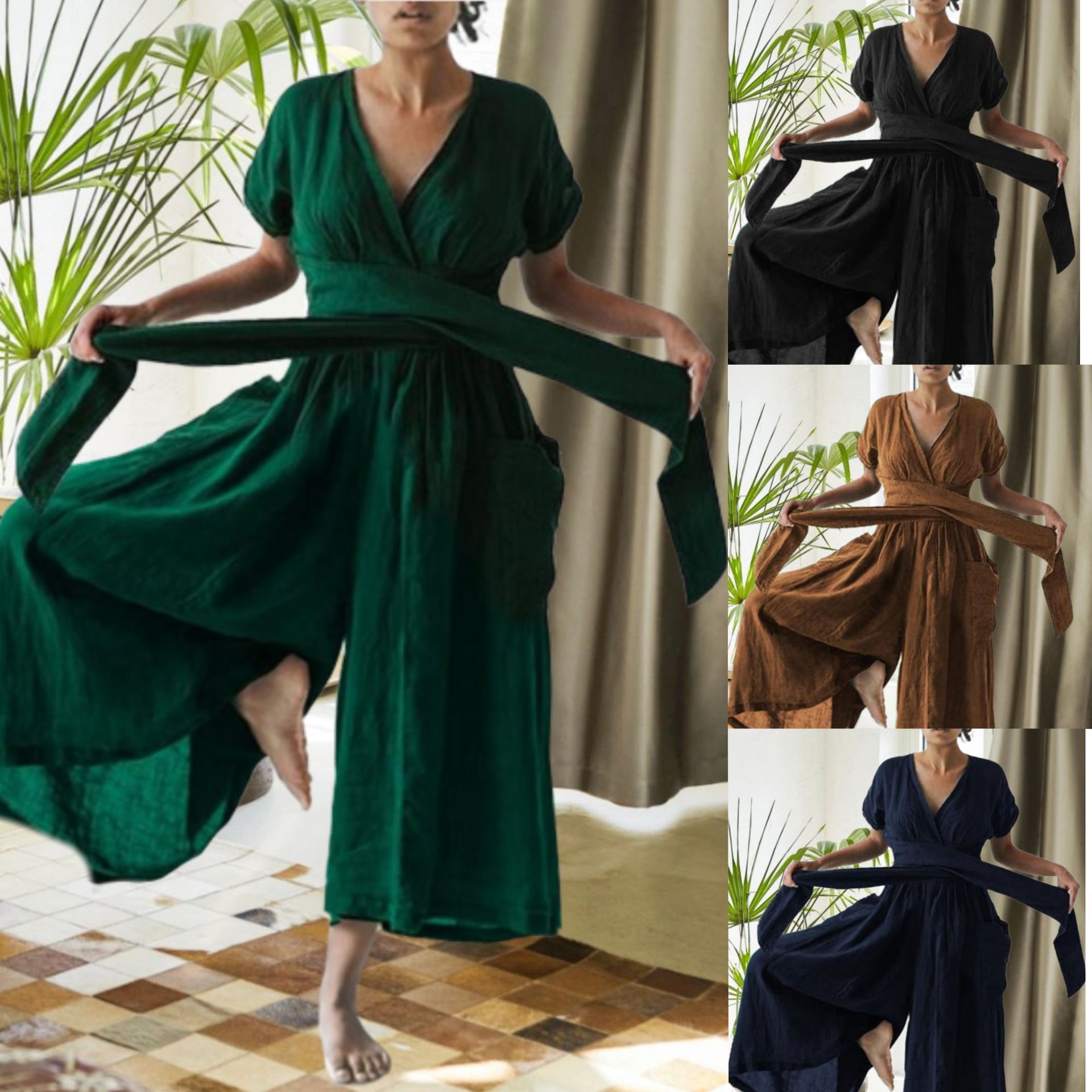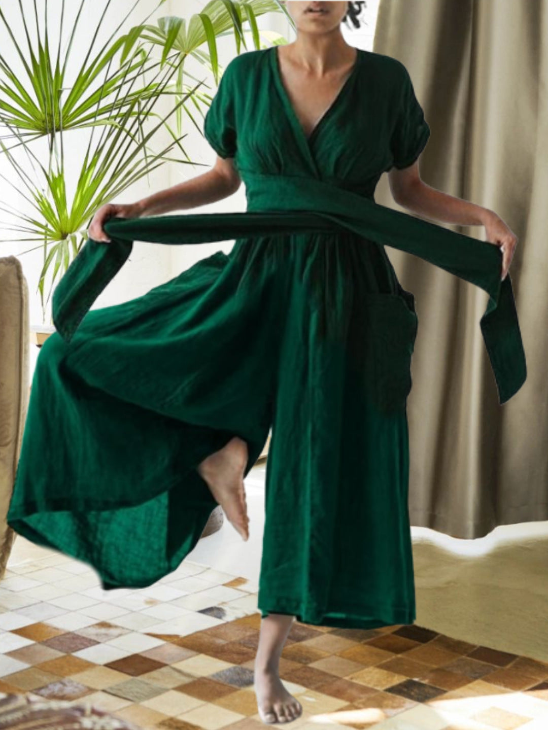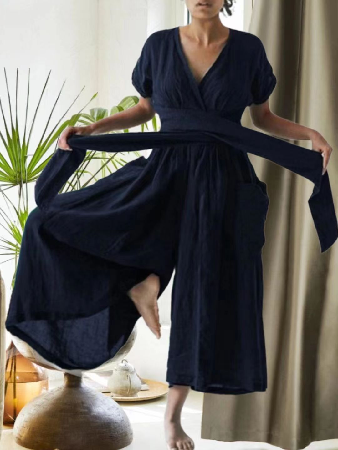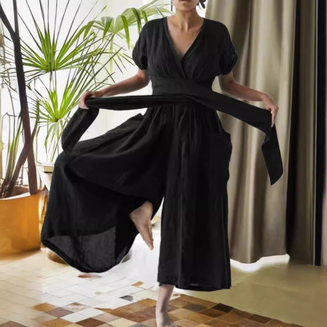 V-neck Short Sleeve Solid Color Loose Casual Jumpsuit