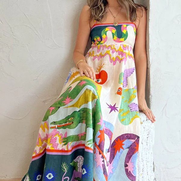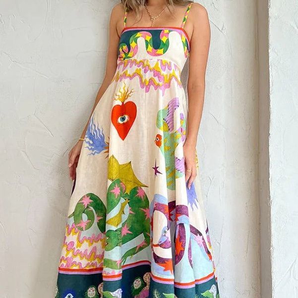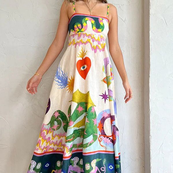 Women's Fashion Printed Loose Casual Sleeveless Sling Large Swing Maxi Dress Women