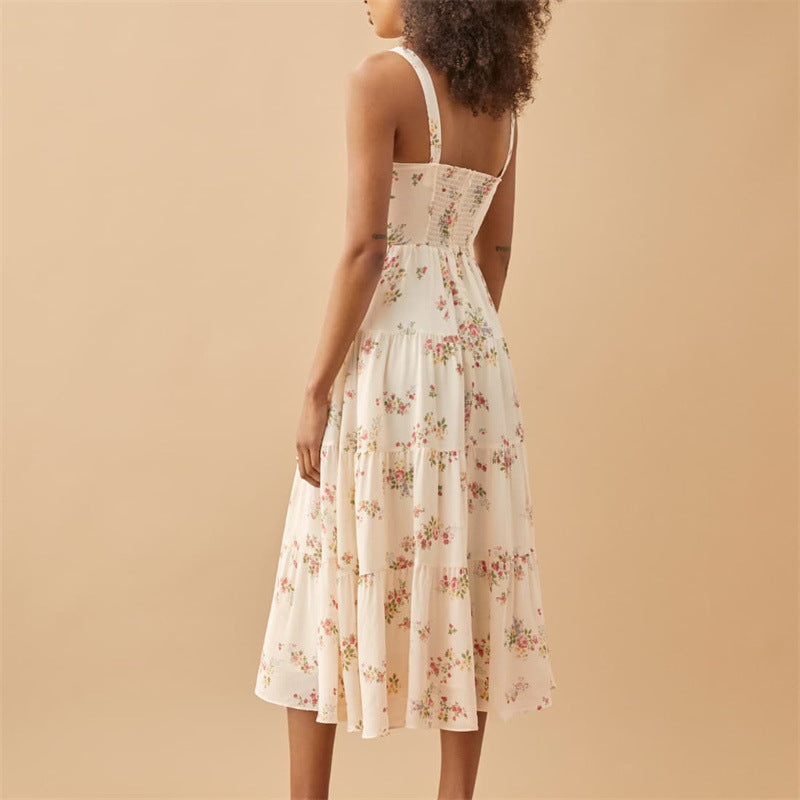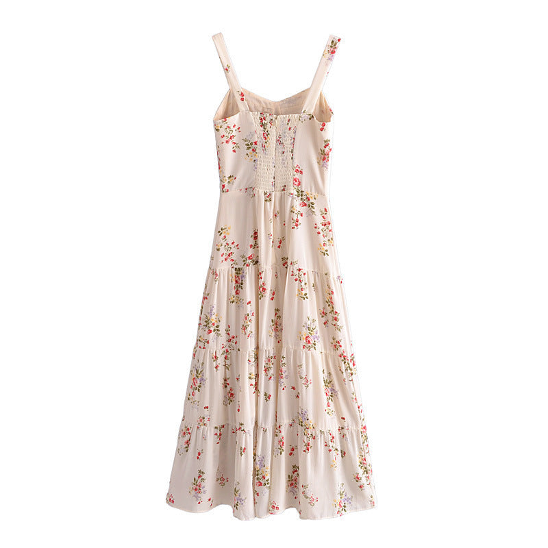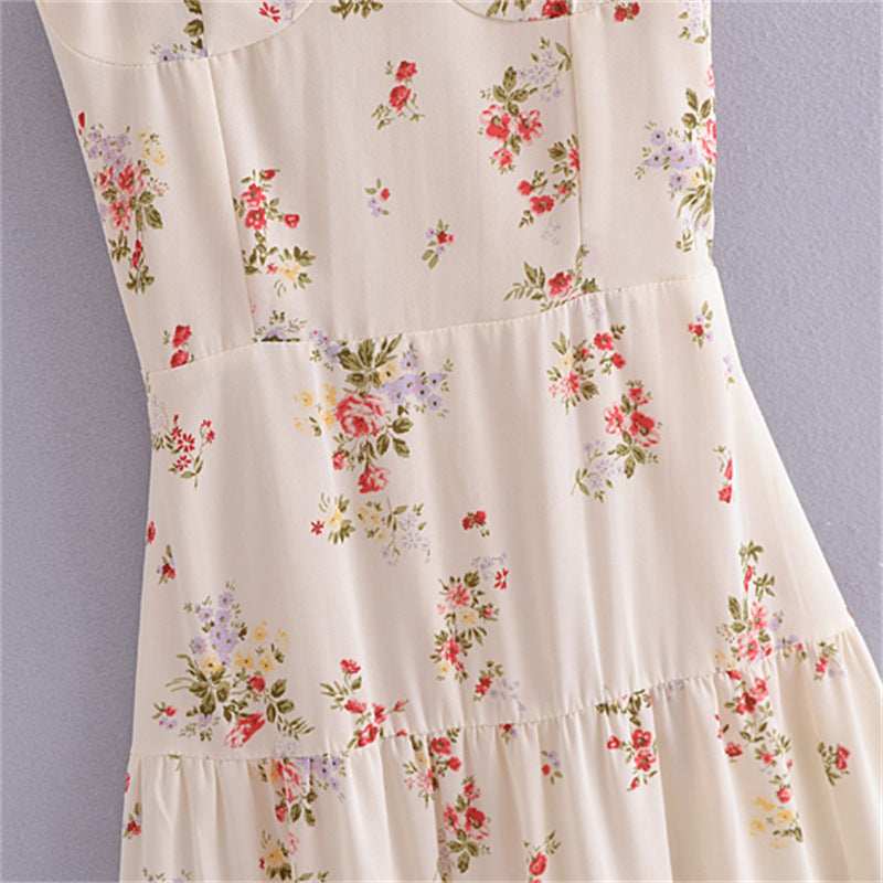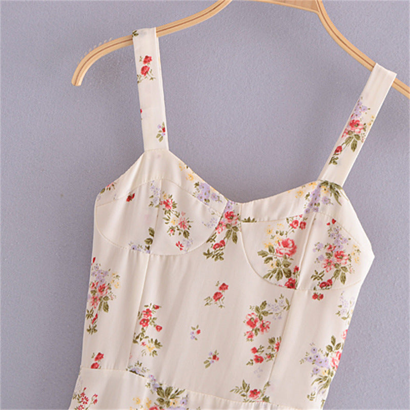 Women's French Style Vintage Small Floral Printed High Waist Slim Fit Slimming Suspenders Dress